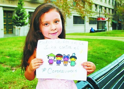 在智利首都圣地亞哥,5歲的女孩達(dá)娜·蘇亞雷斯用畫作表達(dá)了心聲:“我們團(tuán)結(jié)起來(lái)抗擊冠狀病毒!”新華社發(fā)
