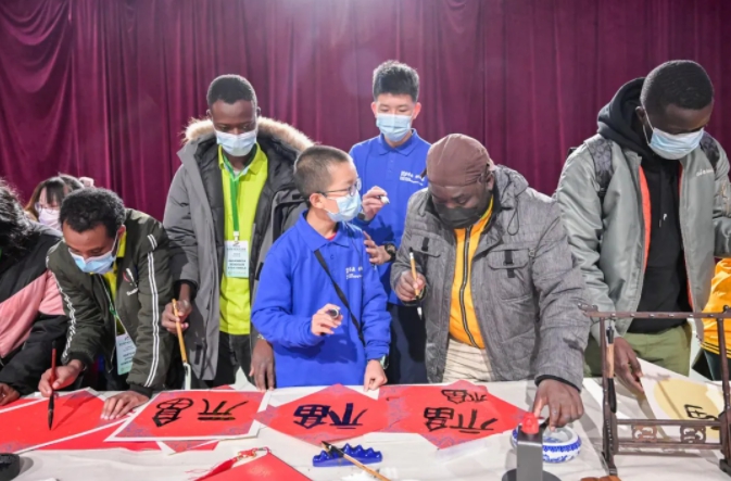 一張張“福”字搭配燙金的紅色宣紙,寓意著吉祥平安,寄托了中非青少年們對美好未來的祝愿與向往。大家舉起自己的作品合影留念,大聲喊出北京冬奧會主題口號“一起向未來”,共同祝福北京冬奧會取得圓滿成功。